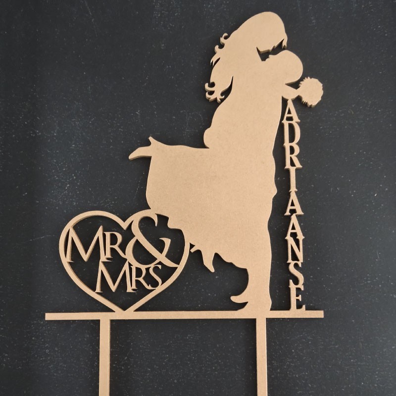 Mr & Mrs silhouette wedding cake topper where the groom is lifting up the bride with your surname on the side. Please add your surname in customize box below